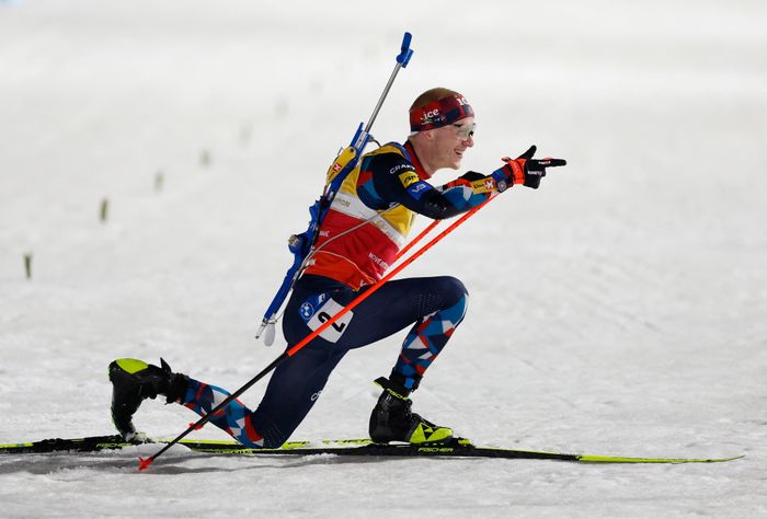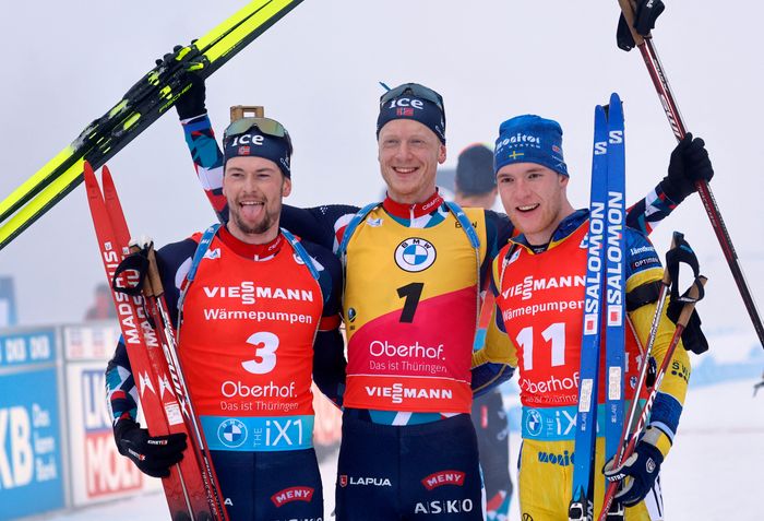 Både Thingnes Bø og Lægreid skjøt 20/20 treff på jaktstarten i fjorårets VM, og ble nummer én og to foran Sebastian Samuelsson. I samme renn falt Tarjei Bø ned til 4. plass med 18/20 treff, Vetle Sjåstad Christiansen gikk seg opp én plass til 5. plass med 18/20 treff, Johannes Dale-Skjevdal falt ned tre plasser og endte som nummer syv med 15/20 treff og Endre Strømsheim gikk seg opp ni plasser til 13. plass med 15/20 treff. Foto: NTB.